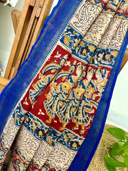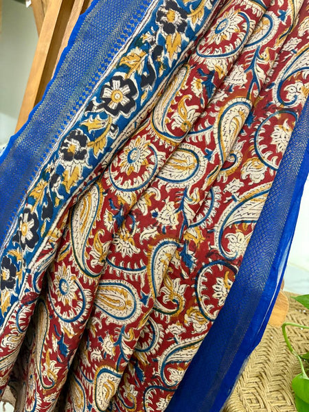 Experience timeless craftsmanship with this authentic handwoven Mangalagiri saree, featuring a luxurious pure silk-cotton base, elegant Nizam border, and exquisite Kalamkari hand block print from Machilipatnam artisans.