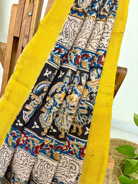 Experience timeless craftsmanship with this authentic handwoven Mangalagiri saree, featuring a luxurious pure silk-cotton base, elegant Nizam border, and exquisite Kalamkari hand block print from Machilipatnam artisans.