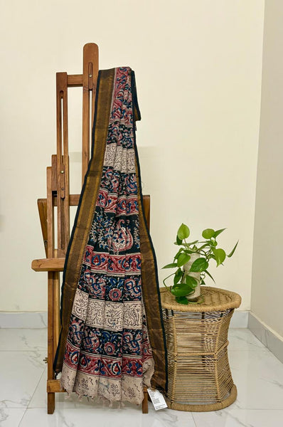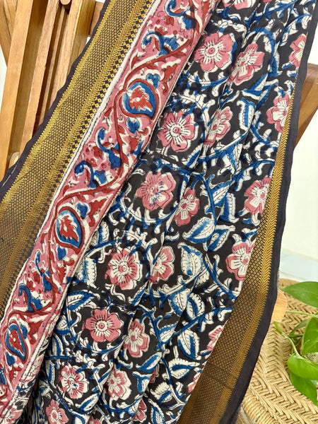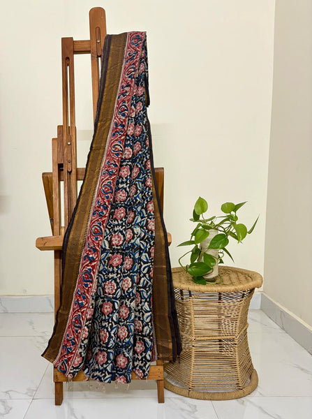 Experience timeless craftsmanship with this authentic handwoven Mangalagiri saree, featuring a luxurious pure silk-cotton base, elegant Nizam border, and exquisite Kalamkari hand block print from Machilipatnam artisans.