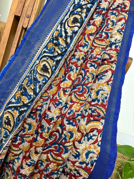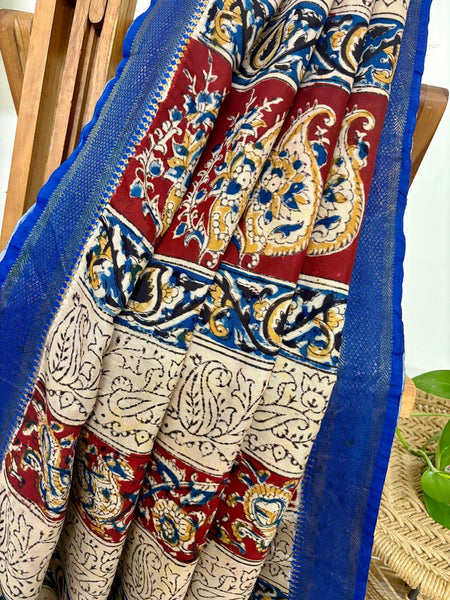 Experience timeless craftsmanship with this authentic handwoven Mangalagiri saree, featuring a luxurious pure silk-cotton base, elegant Nizam border, and exquisite Kalamkari hand block print from Machilipatnam artisans.